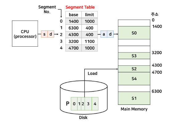 세그멘트를 메모리에 할당하는 방식은 페이지를 할당하는 방식과 동일하나, 테이블의 형태가 조금 다릅니다. 세그멘테이션을 위한 테이블은 세그멘트 테이블이며, 세그멘트 번호(s)와 시작 주소(base), 세그멘트 크기(limit)을 엔트리로 갖습니다. 주소 변환 역시 페이징과 유사하지만, 세그멘트의 크기는 일정하지 않기 때문에 테이블의 limit 정보를 통해 할당을 실시합니다.