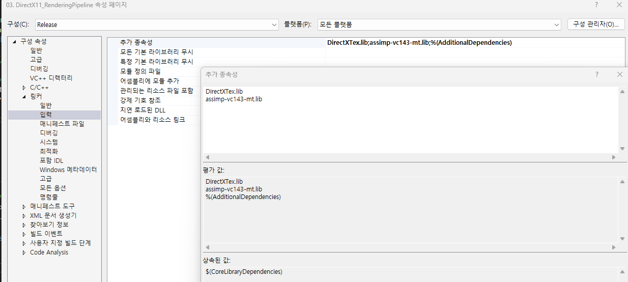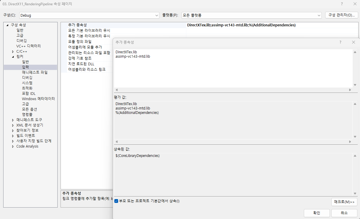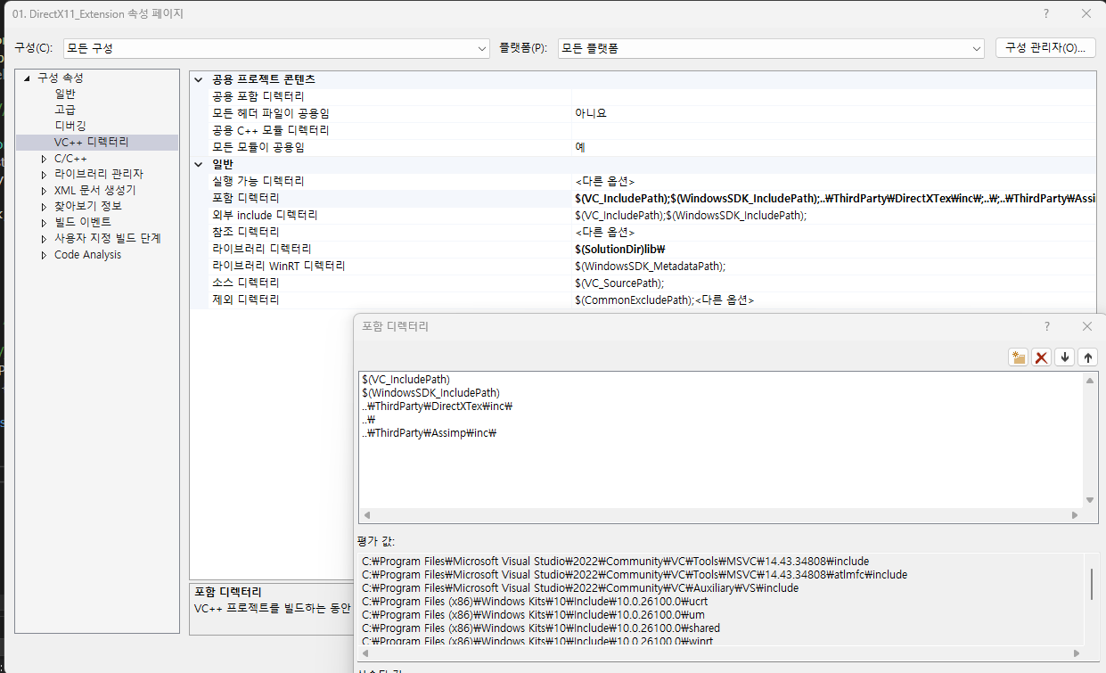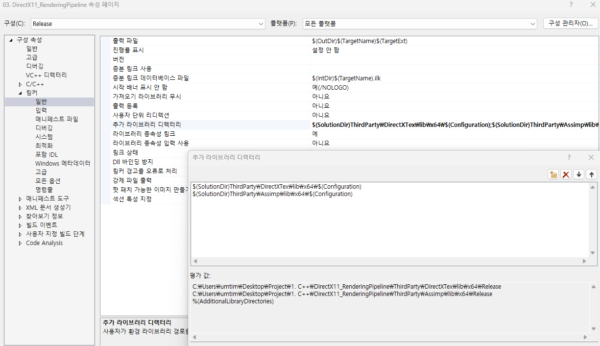 이후 lib 프로젝트들의 포함 디렉터리에 [..\ThirdParty\Asssimp\inc\]를 넣어주면 됩니다.