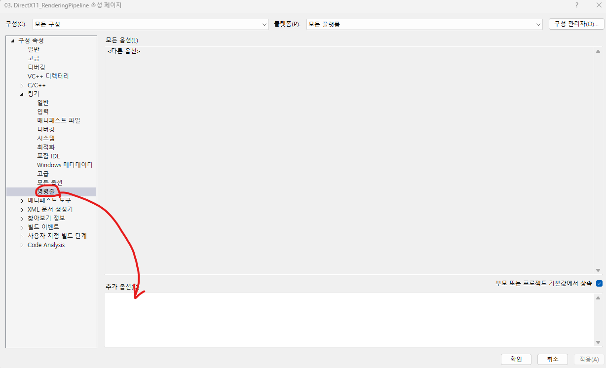 다음은 프로젝트 세팅입니다. 먼저 exe 프로젝트의 링커 설정을 진행했습니다. 일반은 Debug, Release 설정이 동일합니다.