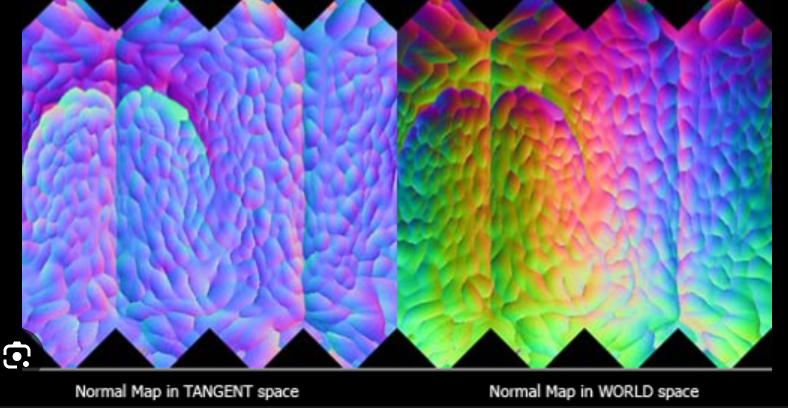 노말 맵은 월드 스페이스 노말맵(World Space Normal Map)과 탄젠트 스페이스 노말맵(Tangent-Space Normal Map)이 있습니다. 둘의 가장 큰 차이는 "어떤 좌표계 기준"으로 노말을 저장하고 불러오느냐에 있습니다.