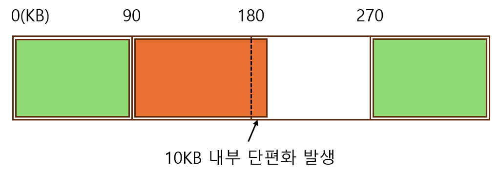 외부 단편화는 반복적인 생성/해제로 인하여 작은 메모리가 중간 중간 발생하는 것이다. 이후 새로운 메모리를 100KB 할당하고자 하는데, 남은 공간은 100KB로 할당이 가능한 상태로 보이지만, 나뉘어져 있기 때문에 할당이 불가능해진다. 프로세스는 메모리에 연속적으로 존재해야하기 때문이다.