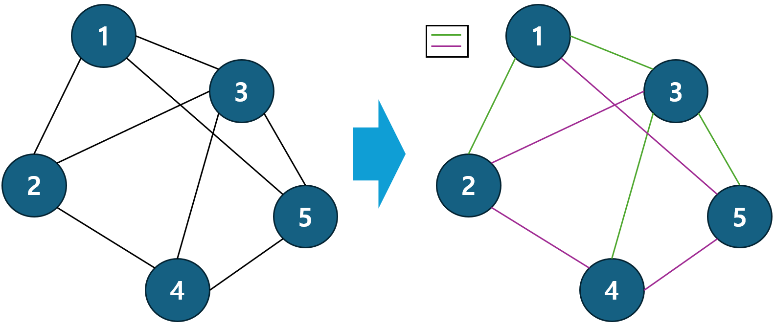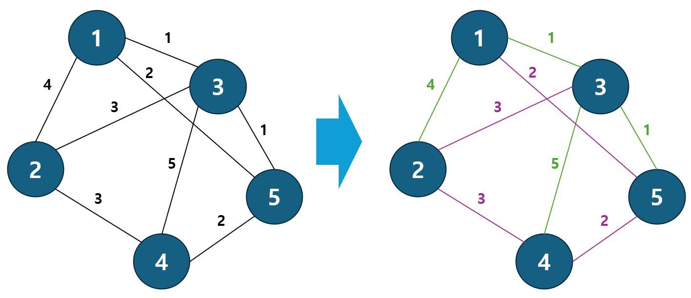 보라색 간선으로 이루어지는 신장 트리와 초록색 간선으로 이루어지는 신장 트리들의 가중치 합은 각각 10(2+2+3+3), 11(1+1+4+5)입니다. 그렇다면 최소 신장 트리는 가중치의 합이 10인 보라색 간선 신장 트리가 됩니다.